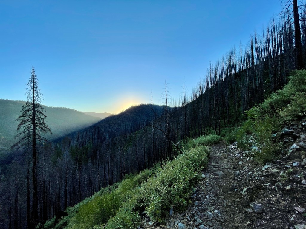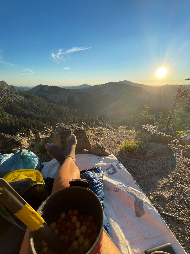 It’s too bad there weren’t lakes for swimming in this section, because it sure got hot! We’re also a lot lower in elevation, and the trail descended down to 3,000 feet at one point which miiight be our lowest point on trail since the southern terminus (don’t quote me on that though). Luckily there’s plenty of trees and forests for shade which helps a lot. We’ll continue on through the Dixie Fire burn zone this next stretch, which will bring a lot of sun exposure and dirt, but hopefully some inspiring new tree and flower growth as well (and an appreciation for trees the rest of the trail). One quote of the day that really hit home was “I’m always thinking about food” -Flinstone. I was a little low on food this section, so I completely agree.